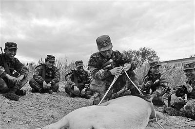 捆綁訓(xùn)練,為何讓豬當(dāng)陪練?筆者了解到,捆綁押解是邊防連隊(duì)的必訓(xùn)課目,由于訓(xùn)練時(shí)怕弄傷戰(zhàn)友,官兵們不敢動(dòng)真格。飼養(yǎng)員王強(qiáng)提出,連隊(duì)是全團(tuán)最大的生豬養(yǎng)殖基地,何不拿即將屠宰的豬當(dāng)陪練。他的想法很快得到連隊(duì)支持。