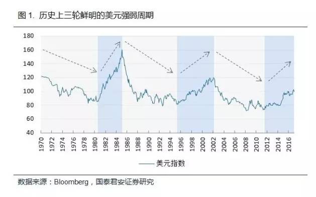 自1973年布雷頓森林體系崩潰后,美元共經(jīng)歷了三輪上升周期和三輪下降周期,目前看來我們?nèi)匀惶幵谝惠喩仙芷诋?dāng)中。推動(dòng)三輪美元上升周期的動(dòng)因各不相同,八十年代初的上升周期主要與高通脹所引發(fā)的加息有關(guān),九十年代末的美元上升則主要受益于美國(guó)經(jīng)濟(jì)的強(qiáng)勁增長(zhǎng),而本輪上升周期則是在一個(gè)超低利率和經(jīng)濟(jì)弱復(fù)蘇的背景之下,美元升值的動(dòng)力主要來自于與其它經(jīng)濟(jì)體貨幣政策分化的結(jié)構(gòu)性因素,我們判斷本輪美元的上升周期仍將持續(xù),但升值的幅度將小于前兩輪。