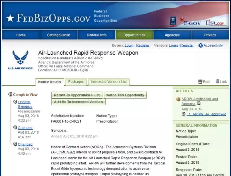圖1. FBO網(wǎng)站上關于空射快速響應武器(ARRW)的合同通知