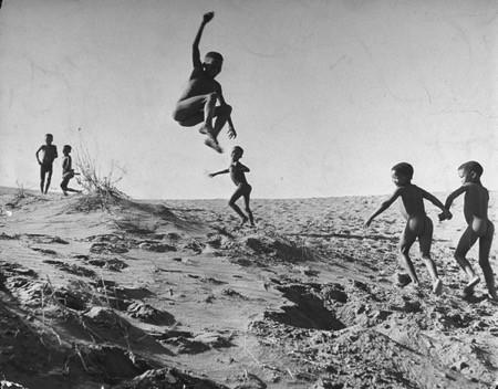 博茨瓦納與南非邊境沙灘上玩耍的布什曼人孩子,攝于1947年。該照片曾在現(xiàn)代藝術(shù)博物館名為“人·家庭”的展覽中展出,該展覽由愛(ài)德華·斯泰肯(Edward Steichen)于1955年組織。