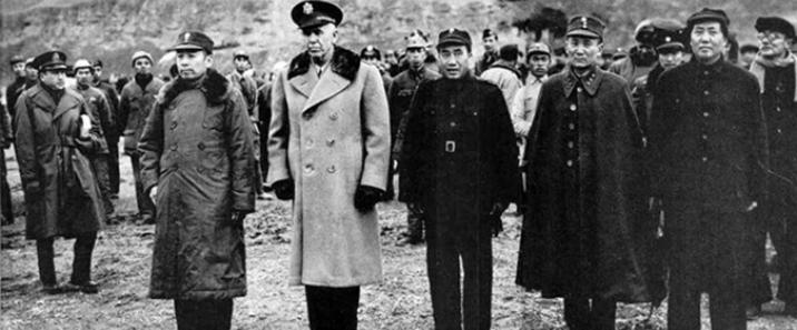 01946年3月4日,馬歇爾作為美國(guó)總統(tǒng)特使,在軍調(diào)小組中共代表周恩來(lái)和國(guó)民黨代表張治中陪同下,飛抵延安。左起:周恩來(lái)、馬歇爾、朱德、張治中、毛澤東。