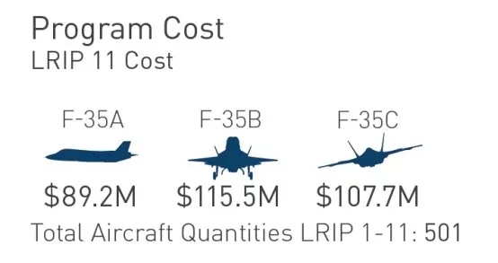 美國洛馬公司在2019年6月4日發布的最新版《F-35戰斗機項目狀態與事實快覽》中提供的低速初始生產第11生產批次,三型F-35飛機的計劃成本數據(美國洛馬公司圖片)