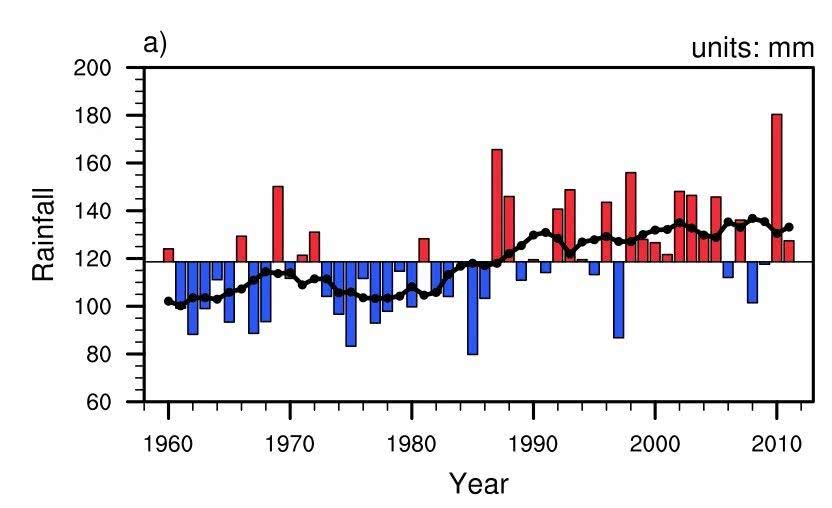 圖4. 1960-2013年期間西北47個測站年平均降水量變化序列,80年代中期之后降水比之前有大幅增加,圖片來自于Wei and Wang (2013)。