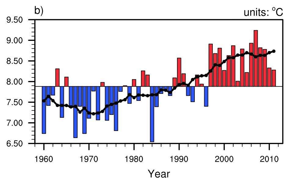 圖5. 1960-2013年期間西北47個測站年平均溫度變化序列,增溫趨勢明顯,圖片來自于Wei and Wang (2013)。