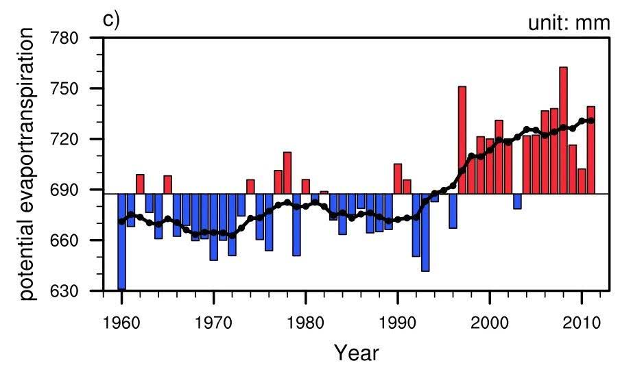 圖6. 1960-2013年期間西北47個測站年平均潛在蒸發(fā)的變化序列,90年代中期有突變增加, 圖片來自于Weiand Wang (2013)。