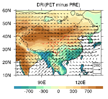 圖3. 用潛在蒸發(fā)量與降水量之差表示的干濕指數(shù)(單位:mm),如果某地蒸發(fā)量大于降水量,則氣候特征為干旱,反之,如果蒸發(fā)量小于降水量,則這個地方氣候濕潤。西北地區(qū)蒸發(fā)量遠(yuǎn)大于降水量,是極端干旱的區(qū)域。所謂“春風(fēng)不度玉門關(guān)”,西北的水汽來源主要來自于西風(fēng)帶。