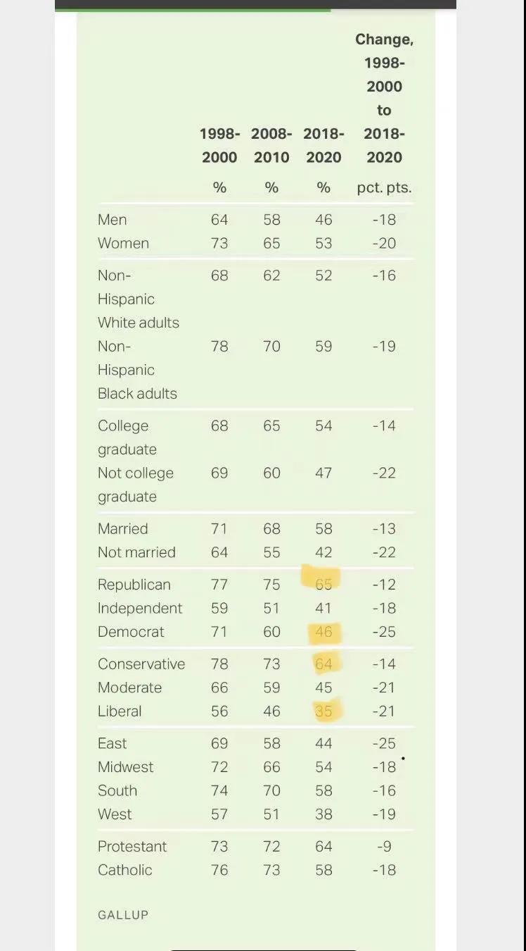 還有幾個數(shù)據(jù)值得一提,在共和黨人中,教會成員的比例是65%,民主黨人的比例則是46%。在保守派中,教會成員的比例是64%,自由派中的比例則是35%。這種差距可以很好地解釋兩黨為何在墮胎權(quán)、同性婚姻以及跨性別問題上針鋒相對。相對于美國的東、西部地區(qū),中西部和南部地區(qū)的教會成員比例要高,這個符合我們的一般認(rèn)知。