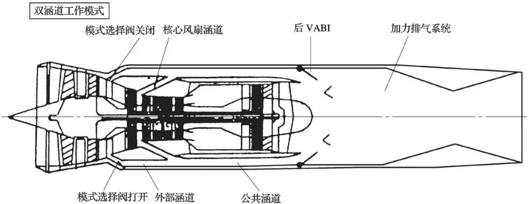 該設計與GE早年針對ATF項目研發的XF120發動機的變循環方式不同,XF120發動機通過控制涵道比的變化實現變循環。該發動機在低功率狀態下采用雙外涵工作模式,在大涵道比下可以獲得低的燃油消耗;在大功率狀態下采用單外涵工作模式,在小涵道比下可以獲得大的推力,并通過加力燃燒室前端的可變面積涵道引射器(VABI)實現風扇和核心機的壓力匹配。