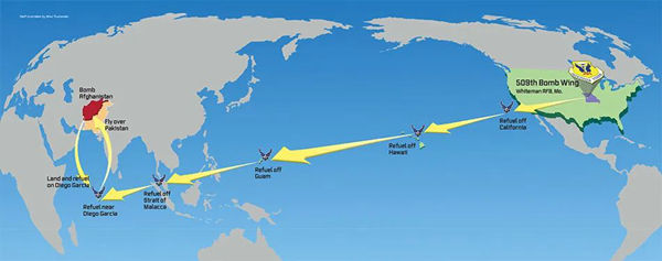 B-2轟炸機從美國本土起飛執行全球打擊時的基地占用情況,B-21將更多地利用前沿基地部署的形式