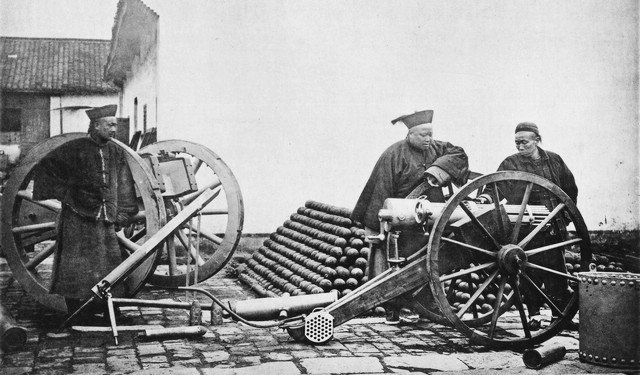 第二次鴉片戰爭之后,洋務運動在中國轟轟烈烈地開展起來,新技術新設備被引入中國,一時形成“同光中興”的局面。圖為1869年南京的金陵機器局制作的連珠炮,即機關槍最早的版本,約翰?湯姆遜攝。