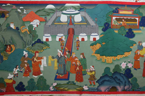 30米卷軸唐卡“涼州會談”,薩迦班智達是吐蕃最具有影響力的宗教領袖,成吉思汗的孫子闊端王得知薩迦班智達在吐蕃的地位和影響之后,決定邀請薩迦班智達來涼州會晤,商討解決吐蕃與蒙古汗國的和平統一問題。1247年,薩班與闊端在涼州舉行了具有歷史意義的會談,并達成共識,將西藏地方正式歸屬蒙古,使得西藏的生靈免受戰爭涂炭