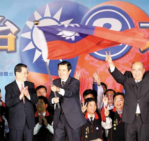 2008年3月14日,馬英九揮舞著國民黨黨旗與蕭萬長、吳伯雄一起為即將到來的臺灣地區(qū)領(lǐng)導(dǎo)人選舉助威。幾天后,馬英九順利當(dāng)選,一時間風(fēng)光無限。