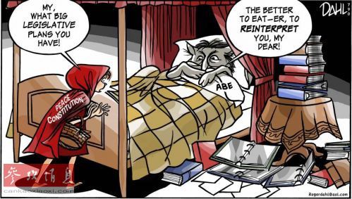 身上寫著“和平憲法”的小紅帽姑娘看到躺在床上的大灰狼“安倍”驚呼:“天吶,你的立法計(jì)劃好龐大啊!”大灰狼陰險(xiǎn)地回應(yīng)道:“最好是吃掉……呃……重新解釋你,親愛的!”