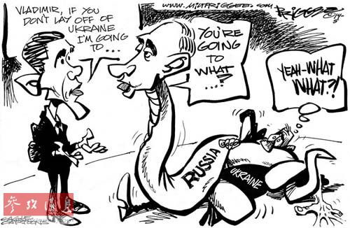 美國總統(tǒng)奧巴馬用“制裁”剪刀剪斷了“俄羅斯”熊腳掌的一只小趾甲。美國白宮4月28日宣布,由于俄羅斯繼續(xù)“干預(yù)”烏克蘭局勢(shì),美國對(duì)俄羅斯進(jìn)行新一輪制裁。
