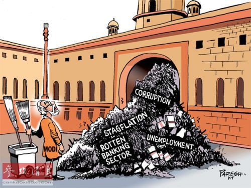 印度新任總理莫迪無奈地看著前政府留下的垃圾山,垃圾中包括“腐敗”、“滯脹”、“墮落的銀行業(yè)”和“失業(yè)”。