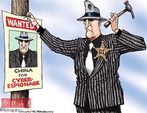 “美國”黑客正在把通緝令釘在柱子上。通緝令上寫著:“因網(wǎng)絡(luò)間諜活動(dòng)通緝中國。”
