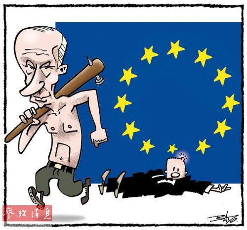 身著正裝的“烏克蘭”被上身赤裸的普京手持釘棍打倒在歐盟旗下,頭上起了一個(gè)包。