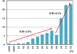 瑞穗銀行產業調查部的報告則顯示,中國對產業機器人的采購需求實際上維持著更為快速的增長:1999年至2008年年均增長達到34%,2009年受到金融危機影響有所下降,但2010年之后出現更為驚人的增長,2009年至2012年的增長率達到61%。