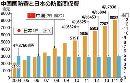 中國目前公布的2014年度國防預算較前年度增長12.2%達到了8082億元,約為日本國防相關費用的2.7倍以上。以「過去二十六年間約40倍,過去十年間約4倍」(防衛白皮書)的速度中增長。當然這其中也有隨著經濟的驚人增長因而增強國防力量的一面,但近年來中國的經濟增長率正處于停滯不前的狀態,遠遠低于10%。即便如此,國防費用的增長率仍達到兩位數。