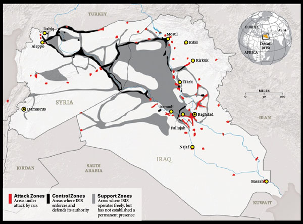 在支持者看來,對疆土的控制是伊斯蘭國權威性的前提條件。這幅地圖采自戰爭研究學院,顯示的是截止1月15日哈里發國控制的疆域,還有它正在進攻的地域。在它統治的地區,伊斯蘭國征收捐稅、控制價格、設立法庭,并提供從醫療保健到教育通訊的各種服務。