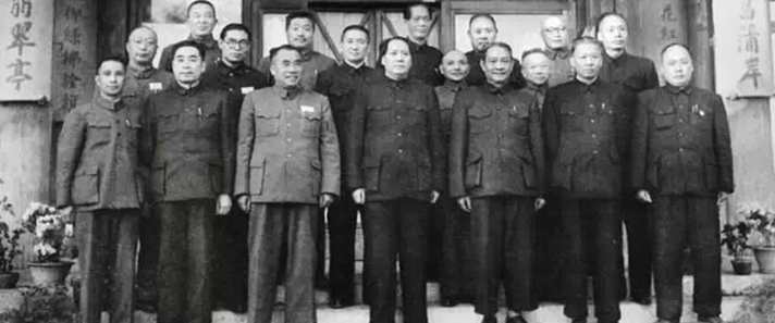 1952年,中央人民政府人民革命軍事委員會部分委員在中南海頤年堂合影。前排右起:陳毅、劉少奇、程潛、毛澤東、朱德、周恩來、粟裕;中排右起:劉斐、張云逸、鄧小平、張治中、高崗、聶榮臻;后排右起:劉伯承、傅作義、蔡廷鍇、賀龍、羅瑞卿