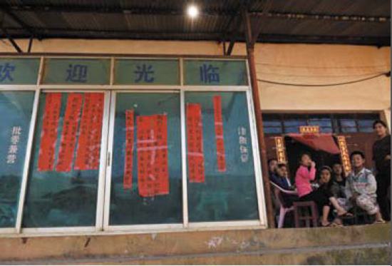 2015 年3 月1 日,中緬邊境附近聚集的果敢難民,一旦戰爭打過來,他們好往中國這一邊逃難。一旁的窗門上貼著“歡迎同盟軍回來”的紅榜。