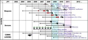 ?根據當時的《防衛計劃大綱》(NDPG)采購彈道導彈防御的主要武器系統(16套PAC-3火力單元和4套“宙斯盾”彈道導彈防御系統),已經列入了2007日本金融年(JFY07)的預算。