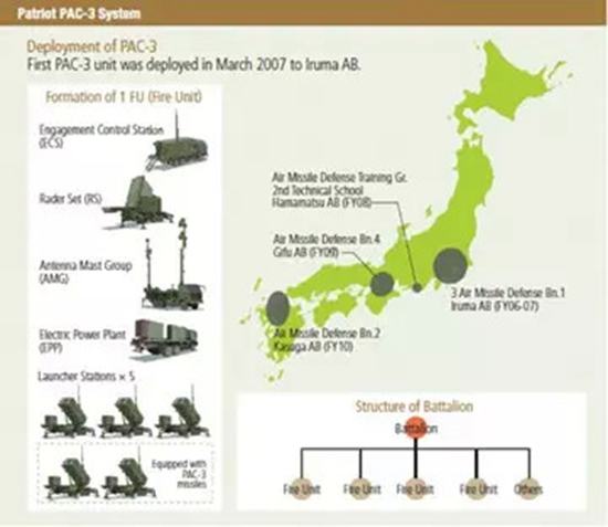 2005年,日本政府表示,計(jì)劃從美國購買PAC-3導(dǎo)彈兩年,然后開始部署在日本許可生產(chǎn)的PAC-3導(dǎo)彈。PAC-3導(dǎo)彈防御系統(tǒng)是美國最先進(jìn)的低層、陸基彈道導(dǎo)彈防御系統(tǒng)。此外,這是一種“具有遠(yuǎn)程、中高空、全天候能力的導(dǎo)彈系統(tǒng),用于對(duì)付戰(zhàn)術(shù)彈道導(dǎo)彈(戰(zhàn)區(qū)戰(zhàn)略導(dǎo)彈)、巡航導(dǎo)彈和先進(jìn)飛機(jī)。”PAC-3導(dǎo)彈比PAC-2導(dǎo)彈更先進(jìn),因?yàn)樗鋫淞顺^12枚攔截彈,使用“擊中并摧毀”技術(shù),并具有彈載雷達(dá)發(fā)射器和制導(dǎo)計(jì)算機(jī)。圖3顯示了部署在日本的PAC-3導(dǎo)彈火力單元的位置。該圖還顯示了火力單元的組成部分。