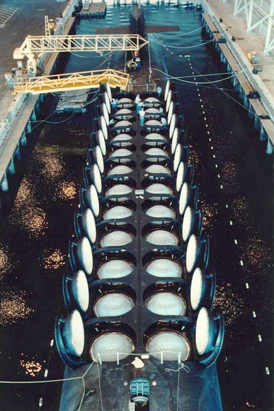 “俄亥俄”級彈道導彈核潛艇是大家非常熟悉的一型核潛艇。“俄亥俄”級潛艇滿載排水量達18700噸,可攜帶24枚“三叉戟”ⅡD5型潛射彈道導彈,導彈最多可攜帶14枚MK76 MK4型10萬噸級核彈頭(或10個MK88MK5型核彈頭),導彈射程最遠可達11000千米。一艘“俄亥俄”級潛艇的總打擊當量超過1億噸,遠超二戰各國釋放火力的總和。曾有報道這樣描述“俄亥俄”級潛艇:它是人類出現以后創造的終極武器,它在“食物鏈”中不是處于頂層,而是頂尖。綜合“俄亥俄”級潛艇的作戰效能,筆者認為這樣的比喻非常恰當,它是彈道導彈核潛艇家族中當之無愧的王者。