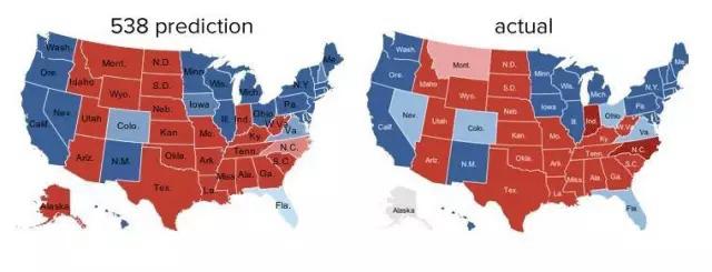 圖4. Nate Silver對2012年美國大選的預測(左)和實際結果(右)的對比(紅色的地方表示共和黨獲勝的州,藍色的表示民主黨獲勝的州)