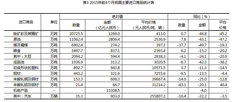 六、鐵礦砂、原油、糧食等主要大宗商品進口量增加,煤、成品油進口量減少,主要進口商品價格普遍下跌。前4個月,我國進口鐵礦砂3.07億噸,增加0.7%,進口均價為每噸413元,下跌45.2%;原油1.11億噸,增加7.8%,進口均價為每噸2536.9元,下跌47.2%;煤6902.4萬噸,減少37.7%,進口均價為每噸397.3元,下跌19.3%;成品油1036.9萬噸,減少6.7%,進口均價為每噸3020.5元,下跌38.2%;初級形狀的塑料892.7萬噸,增加3.7%,進口均價為每噸1.06萬元,下跌14.5%;鋼材443.2萬噸,減少9.5%,進口均價為每噸7255.6元,下跌4.4%;未鍛軋銅及銅材153.3萬噸,減少14%,進口均價為每噸3.97萬元,下跌12.8%。