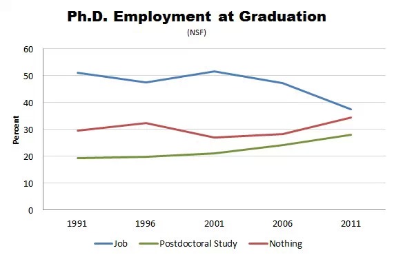 從新世紀開始,博士畢業生就業率就一直在下滑,到了金融危機之后加速下滑,2011年下滑到了就業率不足40%,而失業率卻上升到了接近40%,金融危機后博士畢業后什么都拿不到的比例呈現加速上漲趨勢。另外就是賴著讀博后的人也在不斷的增長,從新世紀開始博后率穩步慢速增長。