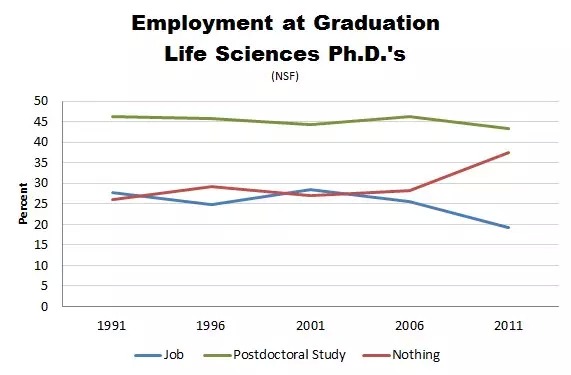 看看悲慘的生命科學博士就業狀況吧,主要是博后,還在下滑,失業率穩步上升,就業率則穩步下滑。唉,怎么一個悲慘了得呢。看看2007年那個轉折點。金融危機最先危害的不是金融業,原來是生命科學科研業呀!金融機構搞砸了,生命科學機構買單,沒天理對不對。不過從圖線上看,生命科學博士們的就業率從上世界90年代初就不怎么高呀,一直徘徊在28%之下。最近更落魄,滑到20%以下了。以前4個生科博士有一個多一點點可以找到工作,現在五個還沒一個能找到工作了。