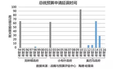 話說這個“拖”字,在美國的預算政治中扮演著很重要的角色。與克林頓、小布什時期的府院博弈相比,奧巴馬政府與國會關系的最大特點表現為“拖延癥”。根據以下兩張圖表中的數據,無論是白宮提交預算的時間還是國會通過的時間,“拖延”在過去幾年可謂常態。16財年僅僅是奧巴馬上任以來第二次按時“交作業”。