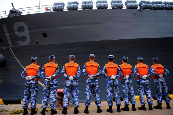 2014年8月5日,在美國海軍第七艦隊的“藍嶺號”旗艦訪問青島港期間,中國海軍人員在“藍嶺號”前排成一行。