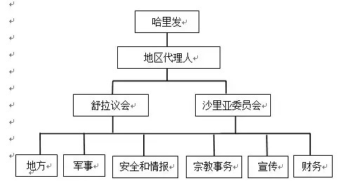 圖1“伊斯蘭國”組織結構圖。資料來源:Barrett,The Islamic State, pp. 23-24。