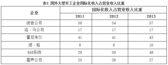 海外市場收入已經成為一流防務企業收入的重要來源,表3為部分軍工企業近年國際化收入占比。洛克希德·馬丁公司總銷售額的15%~17%來自國際市場,其希望未來幾年出口額提高至總銷售額的20%以上;波音公司2013年國際化營業收入占總營業收入57%;雷聲公司軍貿出口額占防務收入比重為20%~25%左右;BAE公司儲備的約650億美元訂單中,非英美訂單額已超過1/3;德國國防產品的40%~50%用于出口;俄軍工企業現持有的武器出口訂單總額約為460億美元,其中80%將在未來3~4年完成交付,這將使俄軍工企業武器出口繼續保持強勁的發展勢頭。