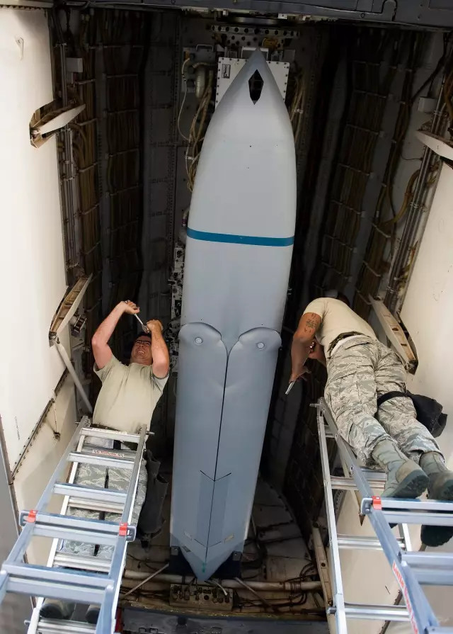 裝在B-1B轟炸機內埋彈艙中的LRASM試驗彈,彈頭下方的黑色窗口為導引頭窗口(美國空軍圖片)