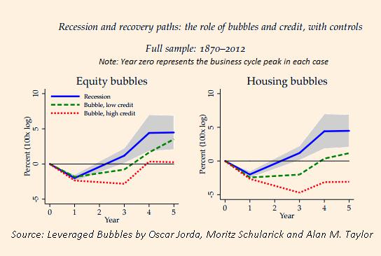 基于一套始于1870年的完善數(shù)據(jù),他們得出的結(jié)論是,資產(chǎn)價格泡沫與過度信貸擴張同時發(fā)生是最危險的,其中房地產(chǎn)泡沫比股市泡沫更危險。(諾亞?史密斯(Noah Smith)在最近一篇博文中給出了精彩的點評。)