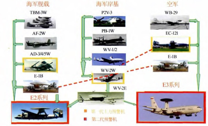 20世紀40年代中期到70年代初期是預警機的早期發展階段,美軍AD-3/4/5W系列、E-1B和E-2A/B等第一代預警機型號相繼服役,其裝備定位為航母編隊中的空中節點,主要解決海軍海上艦艇編隊的低空預警問題,50年代后期才開始被空軍使用,這首先是因為海軍作戰環境主要為海面,無法象空軍借助高山地形提升雷達高度擴展低空探測視距,因此其軍事需求更為迫切;其次是因為較低海情下,雷達探測性能受海雜波影響程度較小,可以基本正常工作。