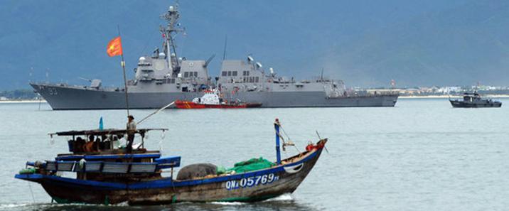 2011年峴港,美國-越南聯(lián)合軍演中一艘美國戰(zhàn)艦,反映了南中國海日益緊張的局勢。 Hoang Dinh Nam/Agence France-Press—Getty Images