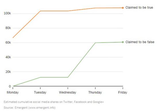 為了研究未經核實的誤報或謠言的傳播機制,哥倫比亞大學數字新聞學塔爾中心(Tow Center for Digital Journalism)的會員記者 Craig Silverman 開發了一款名為 Emergent 的謠言傳播跟蹤工具。這款工具可以記錄每一個傳言及質疑或辟謠的分享次數。從中可以看出,大部分的謠言獲得的分享次數都要比辟謠的高得多。