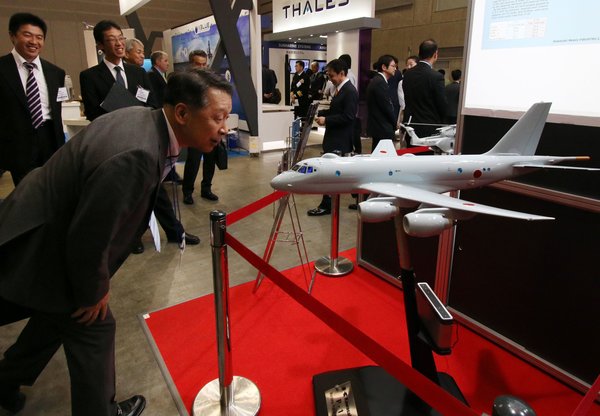 日本今年5月舉辦了第一個軍工貿易展,這是展會上的一架川崎P-1海上巡邏機模型。