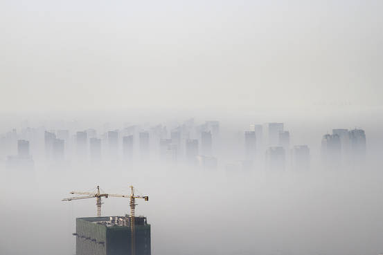 沈陽,一座在建樓房矗立在霧霾之中。