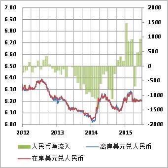 如果觀察人民幣凈流入的時期,我們可以看到,其與人民幣匯率停止走強的聯(lián)系。弱勢的人民幣意味著較多的凈流入。可以想象,如果人民幣巨幅貶值,境外機構(gòu)持有人民幣的興趣大減,紛紛用人民幣購買中國商品,之后再也不接受人民幣付款。