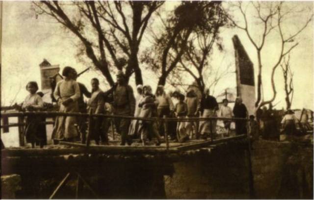 1937年11月10日日本《朝日畫報》刊出一組照片之一,題注為“受我士兵保護的從農(nóng)田勞作回村莊的婦女和孩子們”。1938年7月中華民國軍事委員會政治部《日寇暴行實錄》中收錄同樣的照片,題注為“江南農(nóng)村女子被一批一批地押送到日軍司令部去凌辱、輪奸和槍殺。”