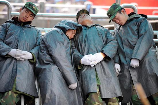 山路崎嶇,搶修車一路顛簸。可車箱板里,官兵們再次發(fā)揮了“隨時隨地能入睡”的本領:幾名戰(zhàn)士挽著臂膀靠在一起漸入夢境;上等兵王家陵蜷縮在角落里打起了盹;排長秦宏春則挽著篷布上的繩子在“釣魚”……據(jù)介紹,這些都是他們自創(chuàng)的一些入睡“小竅門”。