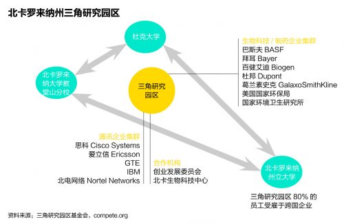 三角研究園的制造業企業有巴斯夫(BASF)、拜耳(Bayer)、思科(Cisco)、飛思卡爾、國家半導體、愛立信、通用電氣、杜邦等一系列全球性企業。在三角研究園內,產業鏈的上下游、研究機構與生產企業、不同領域的協作伙伴以高度緊密的方式進行協作,把溝通與整合成本降到了最低。園區內某一個企業的創新有可能帶動產業鏈上下游的全面跟進與提升。