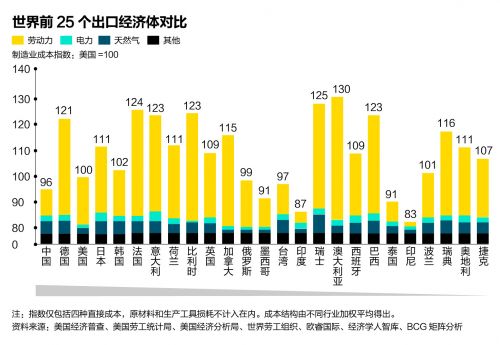 2014年8月份,波士頓咨詢集團發布的制造業成本競爭指數(Global Manufacturing Cost-Competitiveness Index)分析報告指出,美國的制造業成本指數在全球最大的25個出口經濟體中排在較低的位置,大部分原因是拜低廉的能源價格所賜。綜合各方面制造業成本因素分析,中國的制造業成本只比美國低6%左右,盡管美國的制造業人力成本仍然是中國的3倍以上。