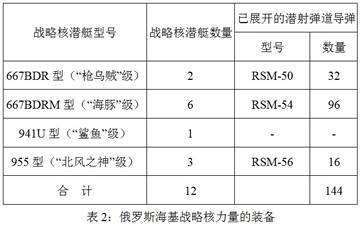 截至2014年底,俄海軍共有4個型號12艘戰略核潛艇:2艘667BDR型(“槍烏賊”級),6艘667BDRM型(“海豚”級),1艘941U型(“鯊魚”級),3艘955型(“北風之神”級)。據評估,所有667BDR和667BDRM型潛艇及2艘955型戰略核潛艇都裝備彈道導彈(一共144枚已展開的潛射彈道導彈,攜帶400余枚核彈頭)。